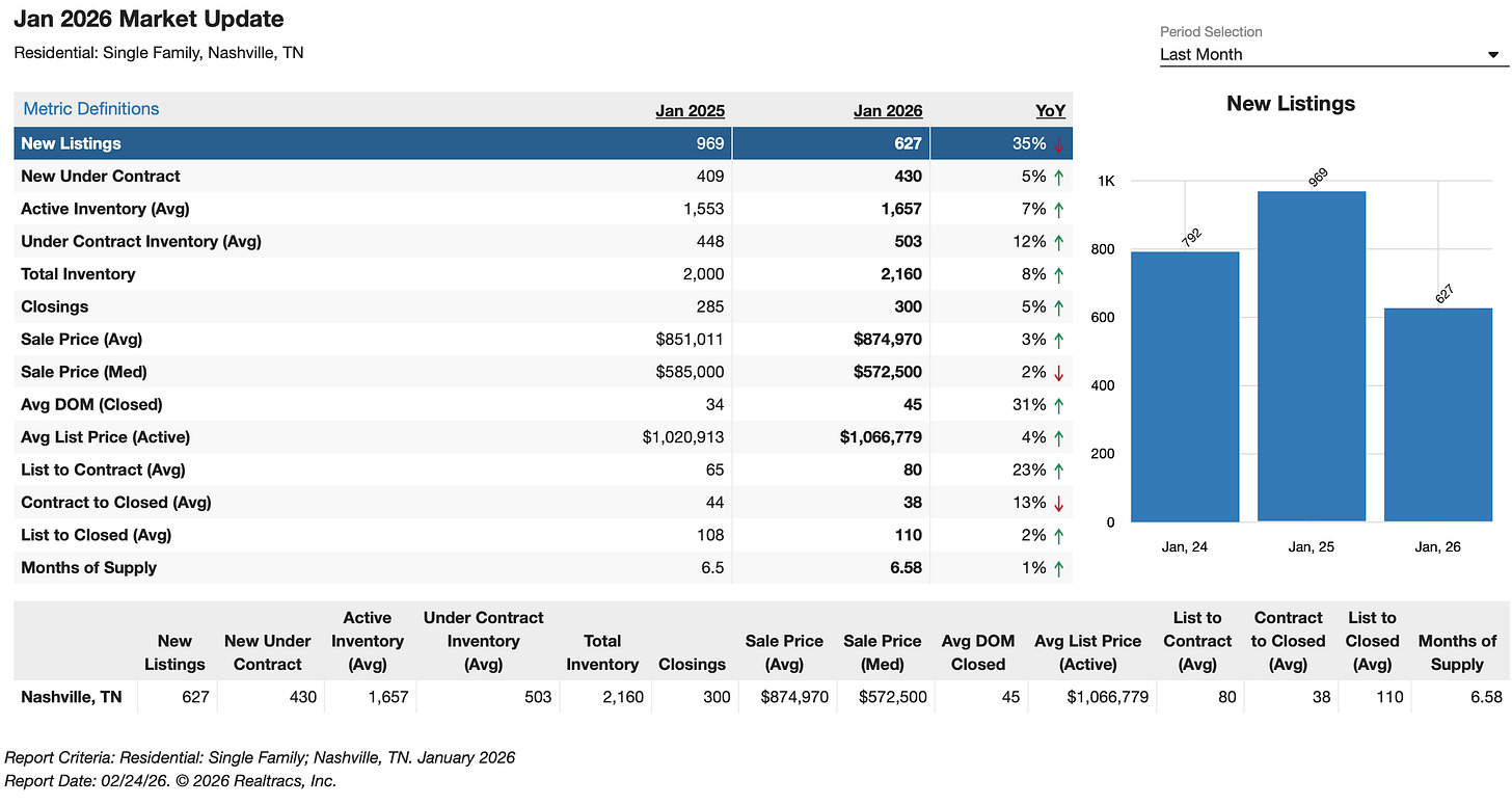 In my home market of Nashville, things are a little different. New listings are down a whopping 35% (likely because of the crazy cold snap we had last month) but all other metrics - from prices to total inventory - are up.
