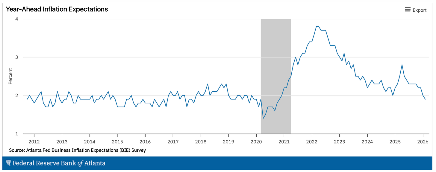 The Atlanta Fed is one of the only government institutions signaling a slowdown in inflation: their expectations measure just now crossed 2% to 1.9%, the lowest meausre since 2019.