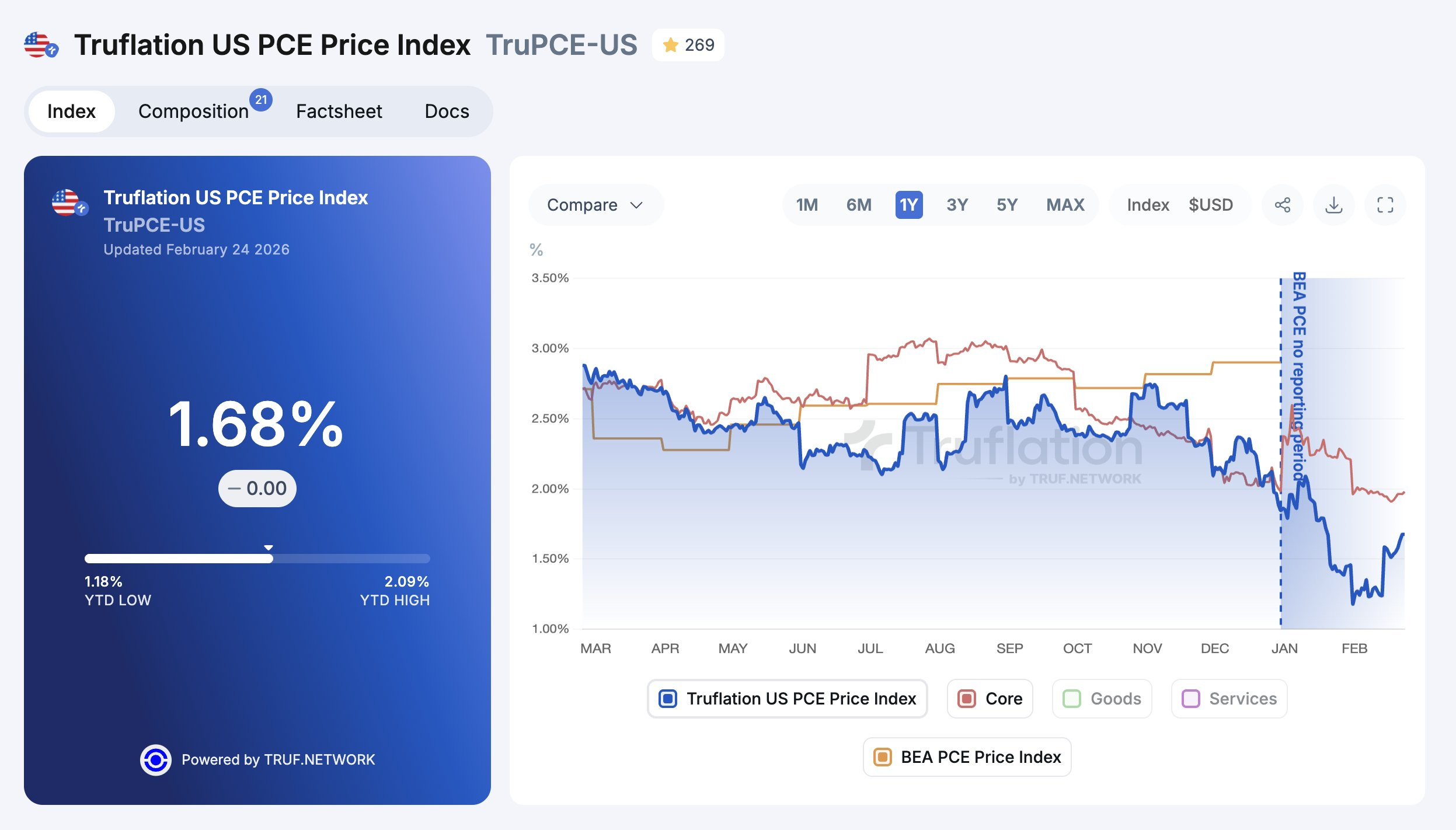 Trueflation numbers - a measure I prefer for its far more accurate shelter cost data - for January were far lower at 1.68%. This index uses millions of actual price points at the point of purchase, sourced from multiple providers, to calculate the most current, comprehensive, and unbiased US inflation indexes.