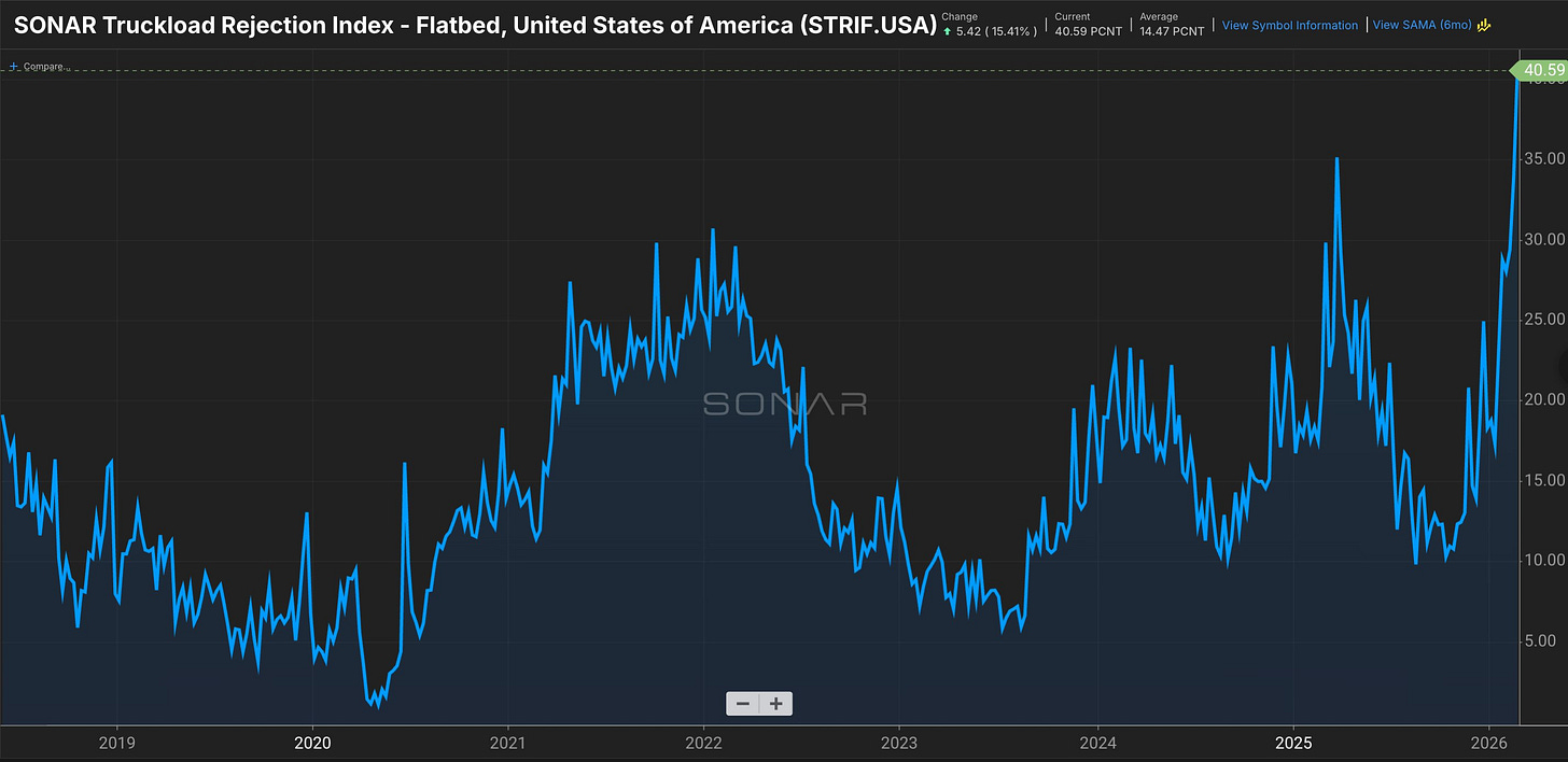 Flatbed rejection rates have surged to 40%, above 2021 COVD extremes. A bullish signal for heavy industrial manufacturing activity ramping up.